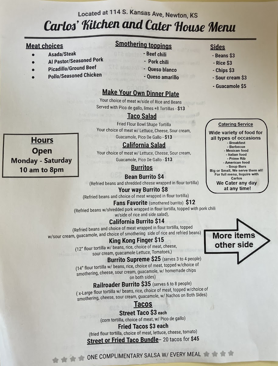 Welcome to Carlos' Kitchen & Cater, where authentic Mexican flavors come alive in the heart of Newton, KS. Our menu is a delightful homage to traditional Mexican cuisine, showcasing an array of mouthwatering options.